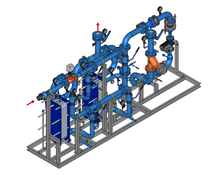 Стандартный тепловой пункт для независимой системы отопления (вентиляции) с резервом теплообменников, двухходовым регулирующим клапаном и резервом насосов 2х100%